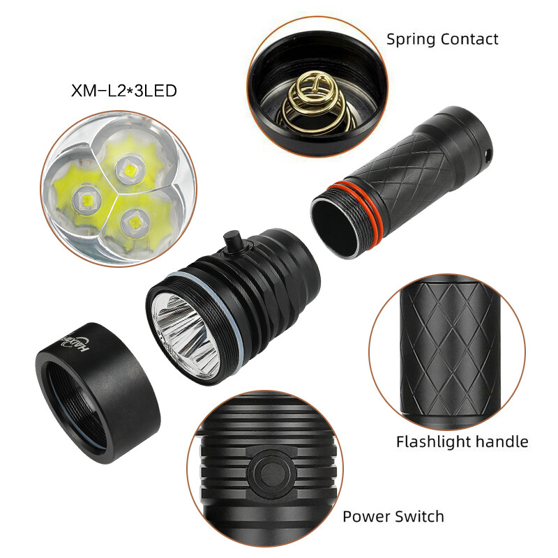 The integrated cooling surface on the lamp head ensures low heat, despite high performance dimmable light intensity for underwater operation, continuously changing light intensity by gently moving the switch.Sealed waterproof design.