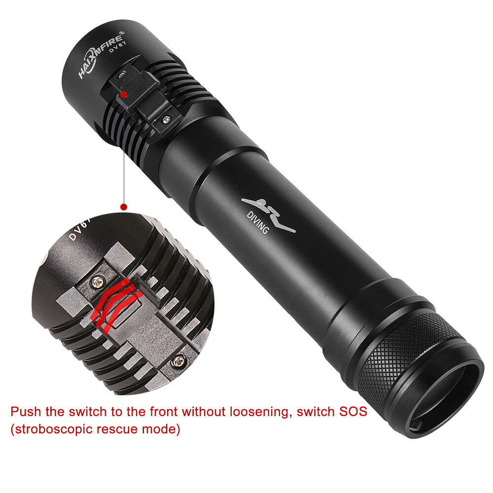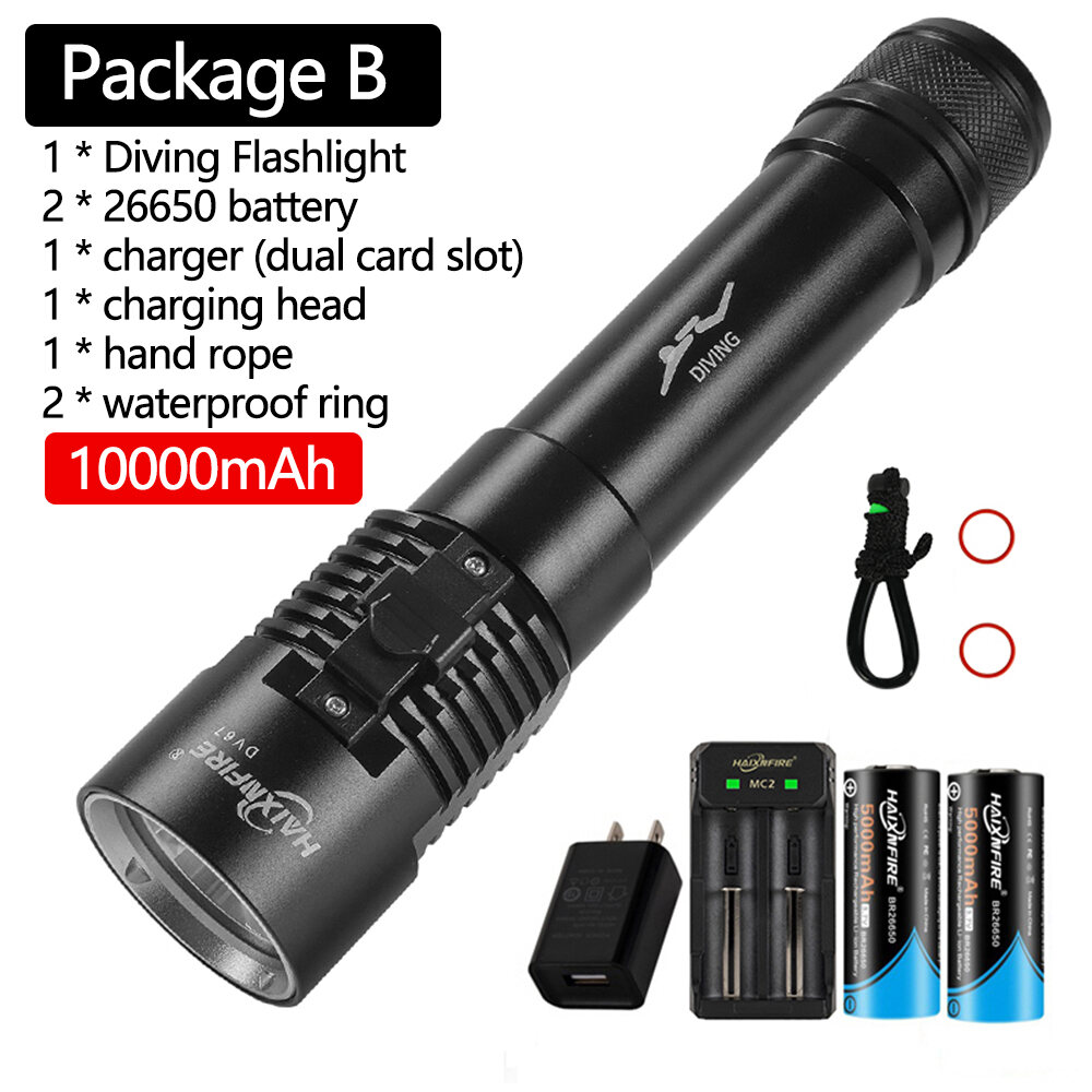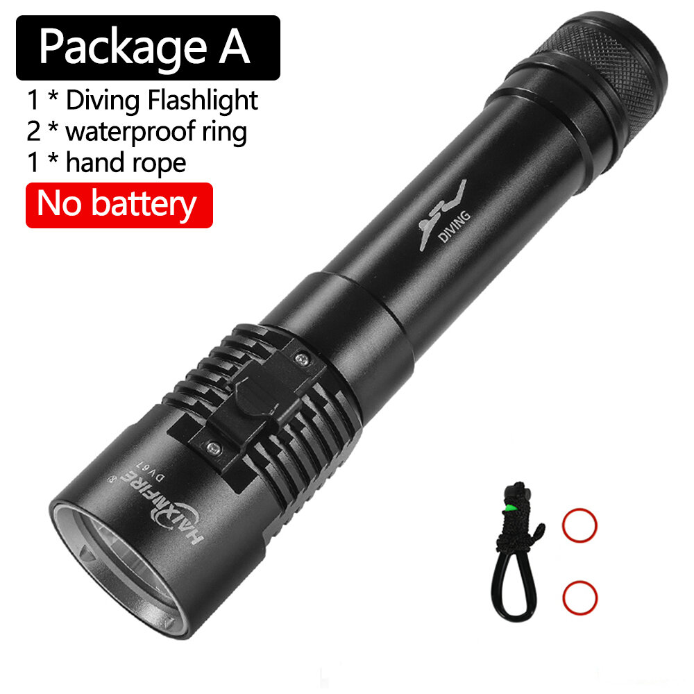 Diving flashlight description: This is a deep diving light, aviation grade aluminum alloy material, good sealing, can dive 20-50 meters deep, underwater lighting is clear, underwater to see the surrounding environment, Marine life, caves, etc., improve the safety and interest of diving.