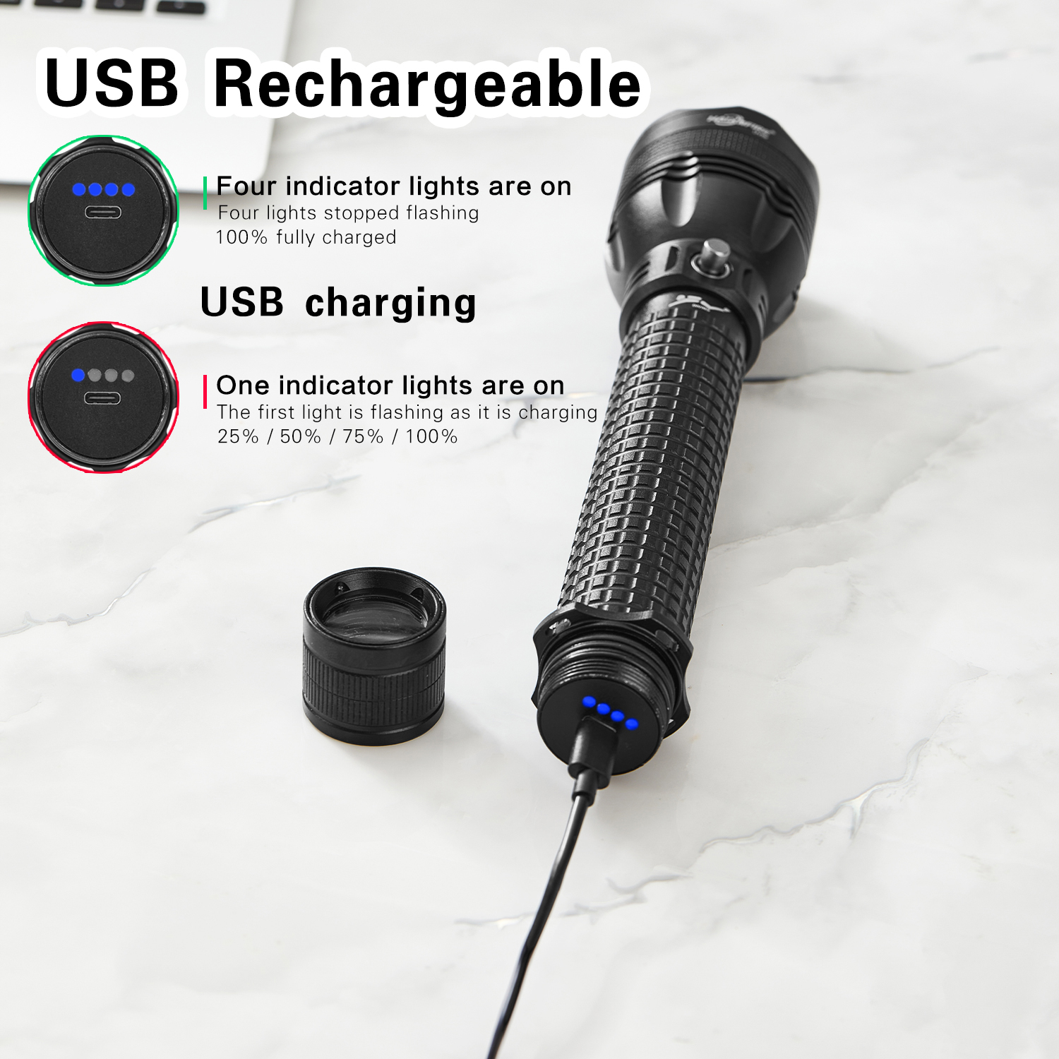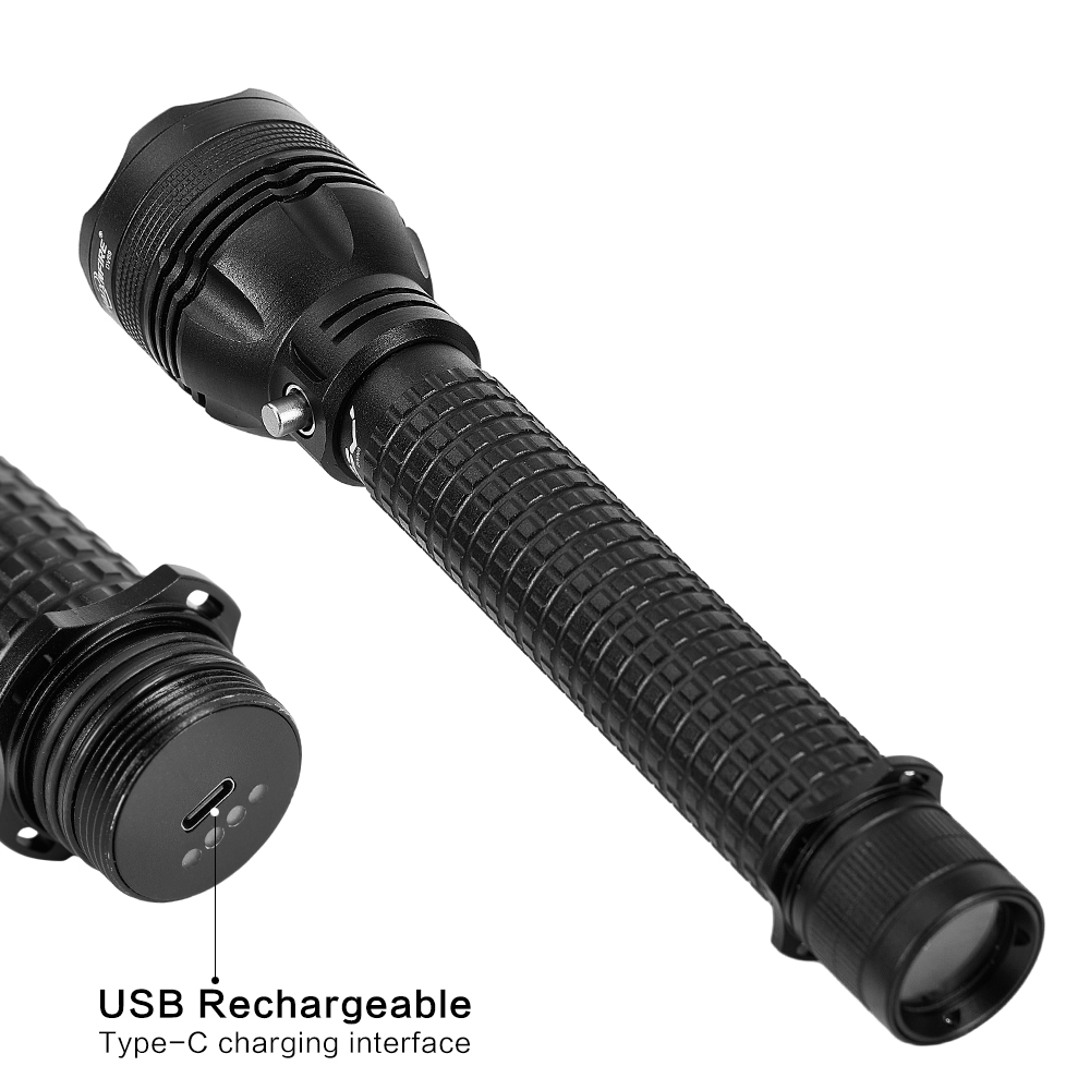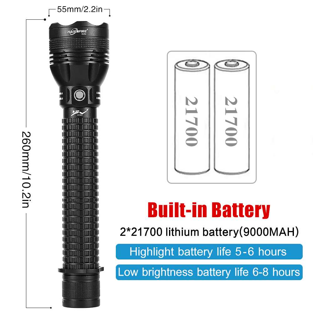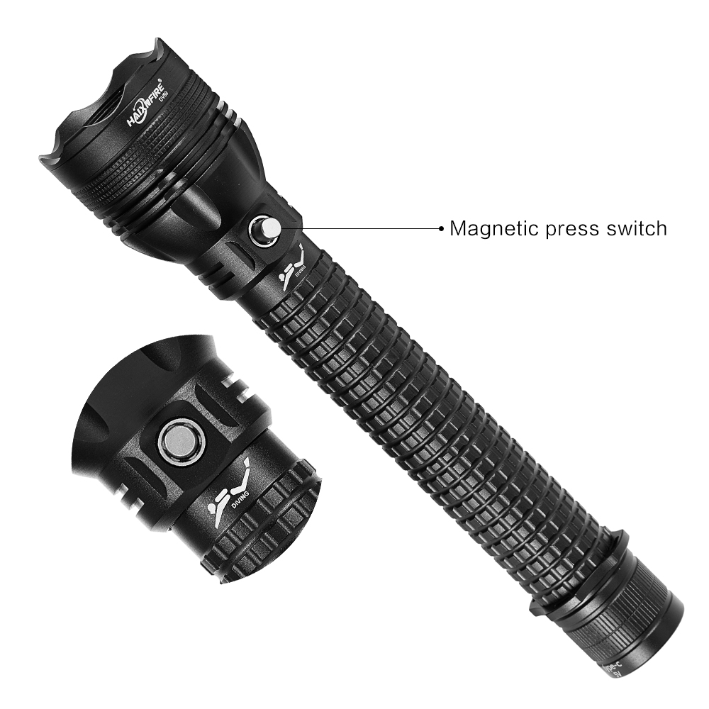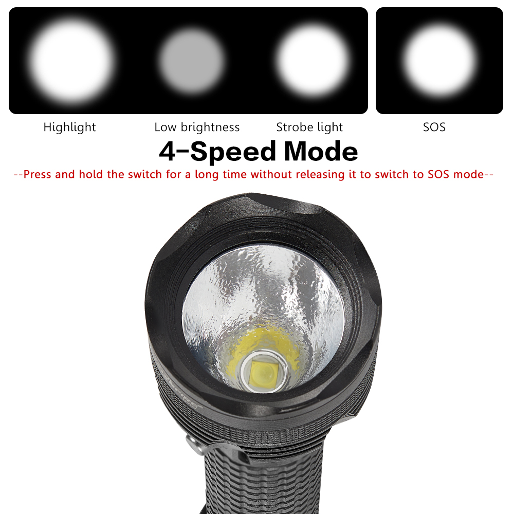 Diving flashlight Description: This is a deep diving light made of aviation-grade aluminum alloy, with good sealing performance. It can dive to a depth of 20 to 50 meters, providing clear underwater lighting. Underwater, you can see the surrounding environment, Marine life, caves, etc., enhancing the safety and fun of diving.